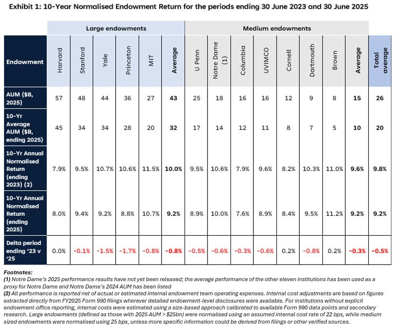This paper is an update two years on from our whitepaper entitled “Analysis of Large US University Endowment Outperformance” covering the 10-year period ending June 2023 of a select group of 12 US university endowments. This update covers the 10-year period ending June 2025. We have made one small change to the methodology and that is to report portfolio performance net of endowment internal investment team costs. Our past reports have not ensured these were reported on an “apples to apples” basis. This has been corrected in both 10-year periods (ending 2023 and 2025).