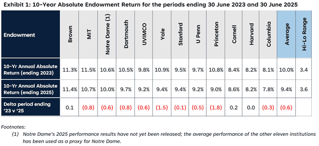 Over the ten-year period from 2016 to 2025, Brown was the highest performer at 11.4%, standing 3.6% ahead of the lowest performer (7.8%). Brown, Cornell, and Harvard were noted for maintaining or marginally improving their absolute performance, while the group saw a largest single decline of a 1.8% reduction in 10-year average absolute returns.